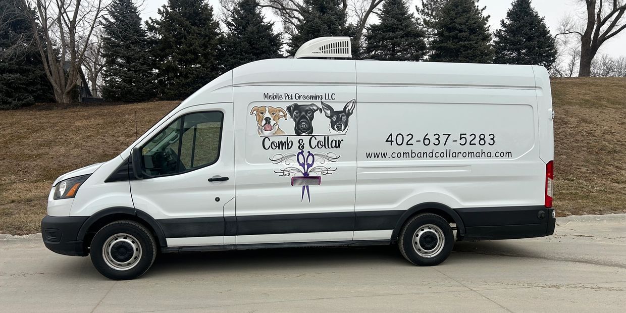 $20 per petComb & Collar Mobile Pet Grooming is an Omaha-based mobile groomer that explicitly lists Council Bluffs among its surrounding-area stops. The business offers one-on-one grooming in customized vans, says it does not use kennels, and handles both dogs and cats across a wide range of ages, sizes, and temperaments. Its site is especially useful for Council Bluffs pet owners because it publishes a $20 per-pet travel charge for Council Bluffs appointments and clearly explains its grooming packages and add-ons.